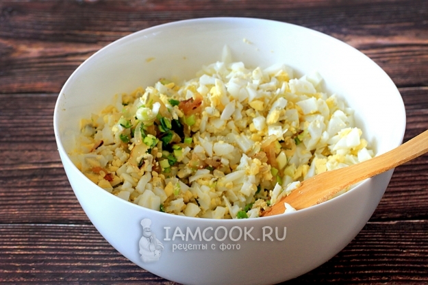 В удобной емкости соединить два вида лука и рубленые яйца.