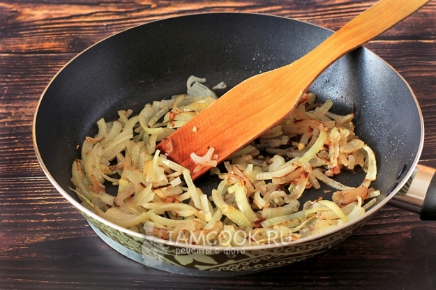 Репчатый лук нарезать соломкой и обжарить в растительном масле до румяного цвета.