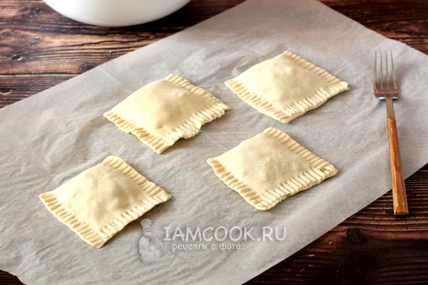 Сложить тесто пополам и плотно прижать, стараясь выгнать воздух изнутри, иначе пирожки могут сильно надуваться при выпечке. Скрепить краешки теста вилкой, чтобы тесто не разошлось в духовке от высокой температуры.