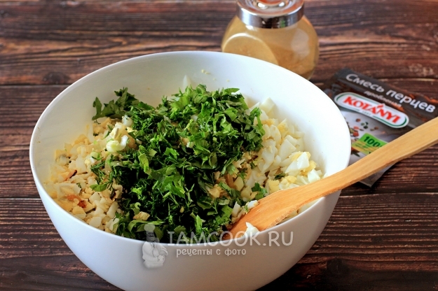 Добавить измельченную зелень. Хорошенько перемешать, посолить по вкусу и сдобрить специями.