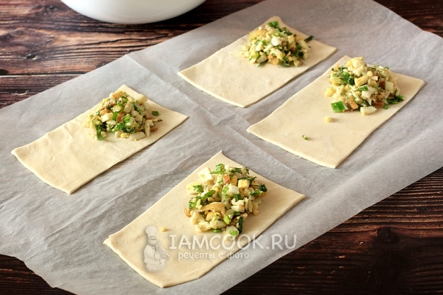 Затем полоски теста еще разрезать пополам. Так получается, если тесто раскатывать довольно тонко. На край каждого прямоугольника выложить начинку.