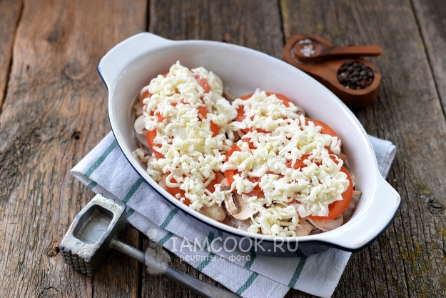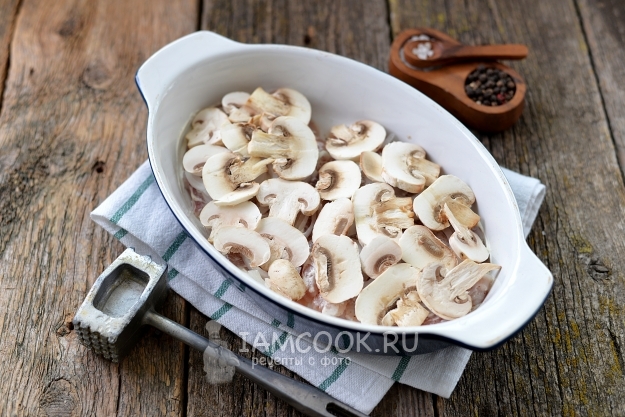 Грибы нарежьте тонкими пластинками, выложите следующим слоем, их тоже можно слегка посолить и поперчить.