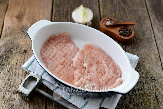 Филе разрежьте вдоль на две части, накройте пищевой пленкой, отбейте с помощью кухонного молоточка. Переложите филе в форму для запекания, посолите и поперчите его вкусу.