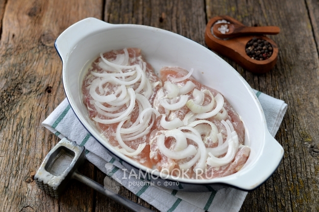 Чуть смажьте куски курицы майонезом, посыпьте их нарезанным полукольцами белым луком.