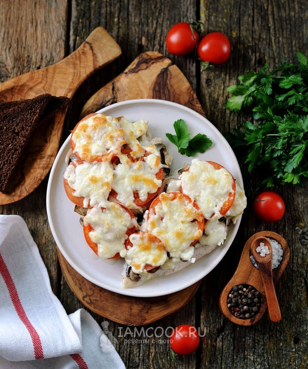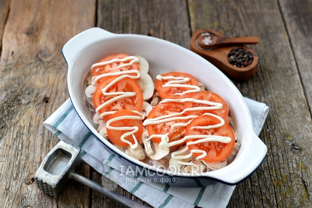 Помидор нарежьте тоненькими кружочками, выложите их на слой грибов, слегка смажьте майонезом.