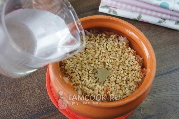 Далее выложила перловую крупу, специи и залила крутым кипятком.