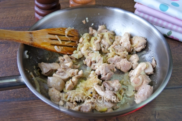 Посолила, поперчила, добавила лук, нарезанный на полукольца, и, помешивая, обжарила на среднем огне до мягкости лука.