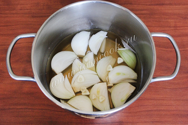 Кусочки лука и чеснока варите в вине пять минут на среднем огне.