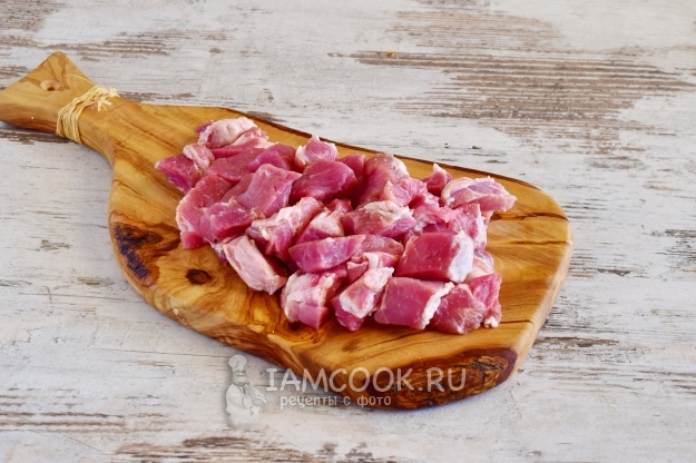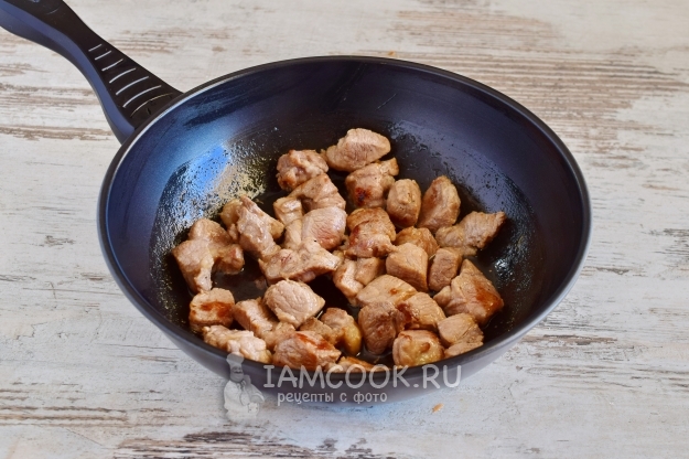 В сковороде разогреть растительное масло. На сильном огне обжарить мясо 5-7 минут, помешивая.