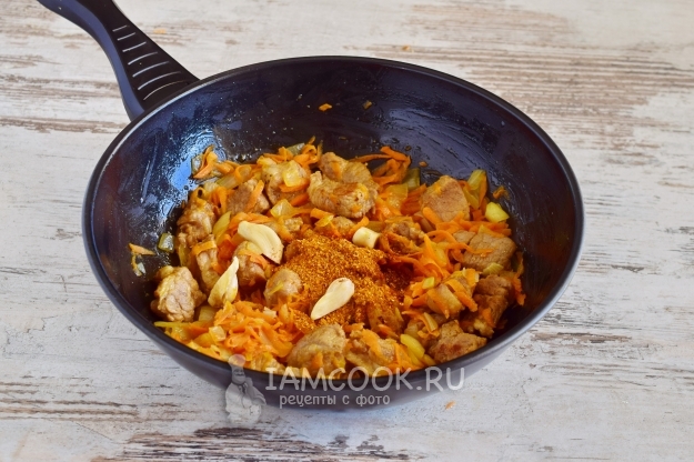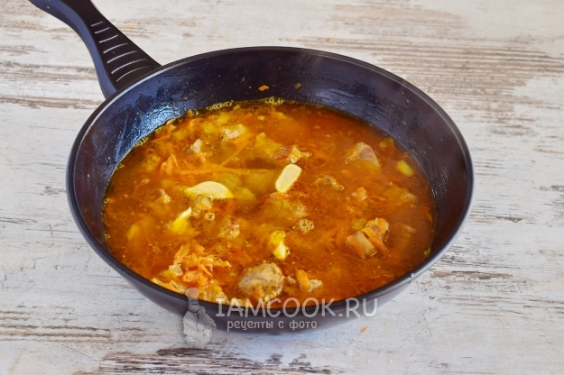 Залить содержимое сковороды кипятком, чтобы он покрыл мясо с овощами. Убавить огонь до среднего и готовить мясо с овощами и приправой 10-15 минут.