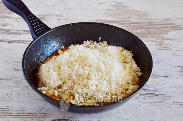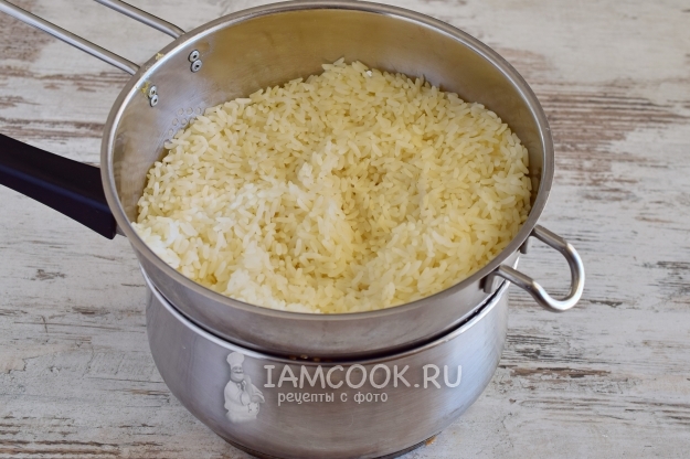 Тем временем отварить рис в кипящей подсоленной воде согласно инструкции на упаковке риса. Я готовила свой рис 12 минут. Слить с готового риса воду.