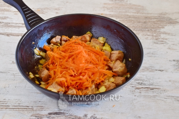 Добавить в сковороду морковь. Обжарить мясо с овощами минут 10, помешивая.
