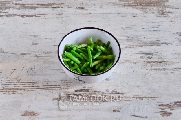 Стручковую фасоль нарежем на равные по размеру кусочки. Если у вас фасоль замороженная, не стоит ее предварительно размораживать.