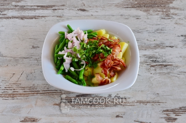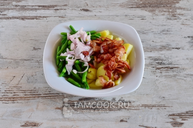 Добавим в миску с овощами обжаренный бекон вместе с вытопившимся жиром.