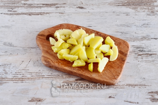 Прежде всего в кастрюле с подсоленной кипящей водой отварим картофель в мундире. С готового картофеля сольем воду, дадим картошке остыть минут 10, затем снимем с него кожуру и нарежем полукружочками.
