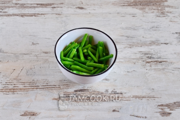 В кипящей подсоленной воде варим стручковую фасоль 7 минут, затем сливаем с фасоли воду и тут же заливаем её ледяной водой или водой с добавлением кусочков льда, оставляем фасоль в воде на 2-3 минуты, так она сохранит свой яркий зеленый цвет после отваривания.