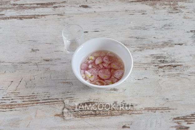 Лук красный или фиолетовый нарежем колечками и замаринуем в смеси уксуса и воды на 10 минут.