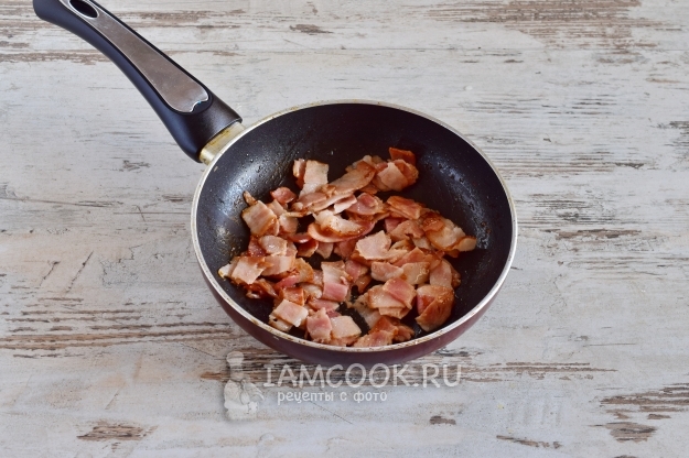 Обжарим бекон, помешивая, на сухой сковороде до хрустящего состояния.