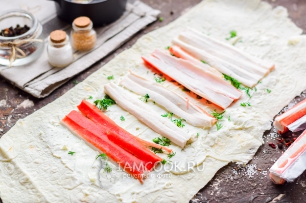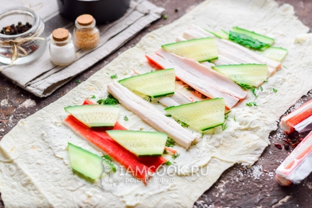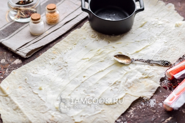 Крабовые палочки раскрутить и разложить пластины по всей поверхности лаваша.
