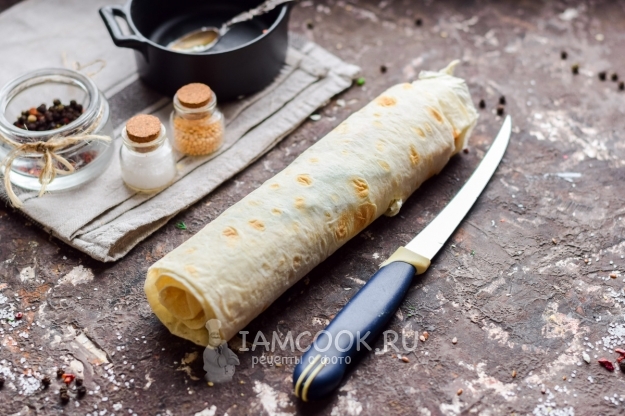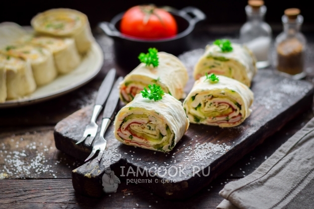 Свернуть лаваш рулетом и положить на полчаса в холодильник. После этого готовый рулет из лаваша с крабовыми палочками и крем-сыром необходимо нарезать кусочками и можно подавать к столу.