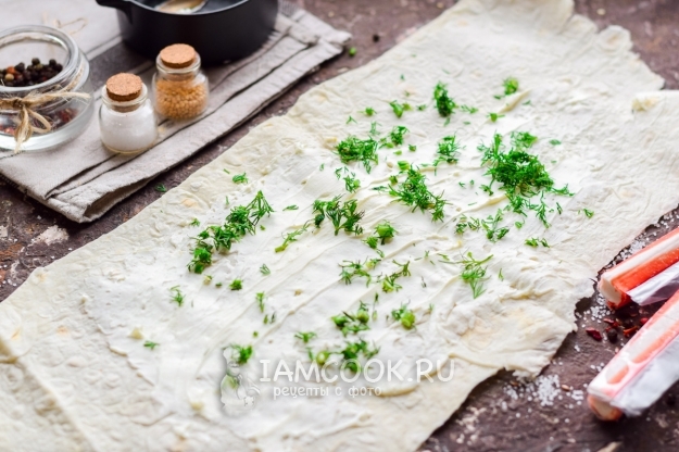 Нарезать немного свежего укропа или любой другой зелени. Посыпать укропом лаваш.