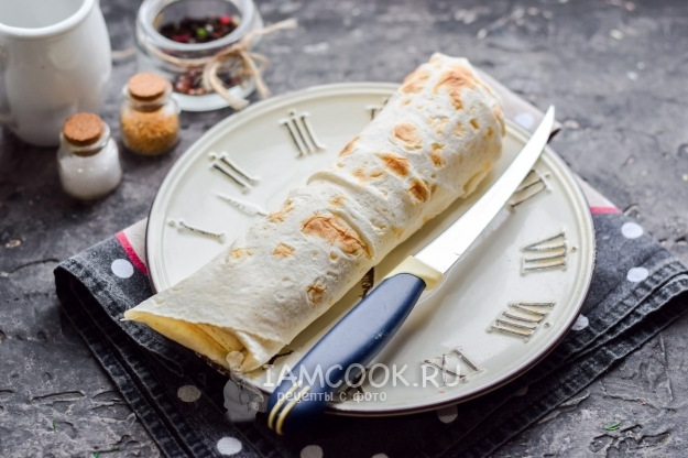После свернуть лаваш рулетом и переложить на полку холодильника, оставить лаваш на час в покое. Спустя время нарезать рулет из лаваша с крабовыми палочками и болгарским перцем порционными кусками и подавать к столу.