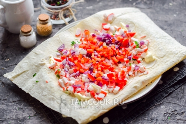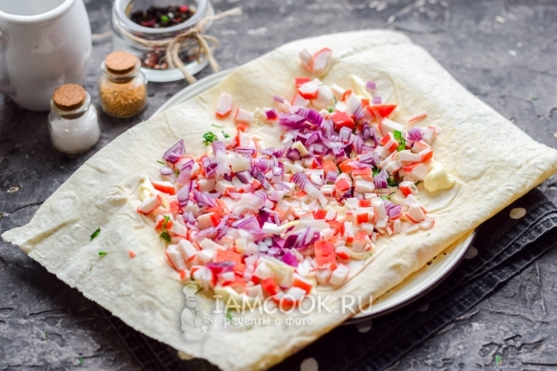 Крабовые палочки заранее разморозить. Нарезать палочки маленькими кубиками и выложить по всей поверхности лаваша.