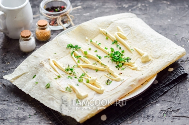 Расстелить на рабочей поверхности лист тонкого армянского лаваша. Смазать лаваш небольшим количеством майонеза, притрусить нарезанным укропом.