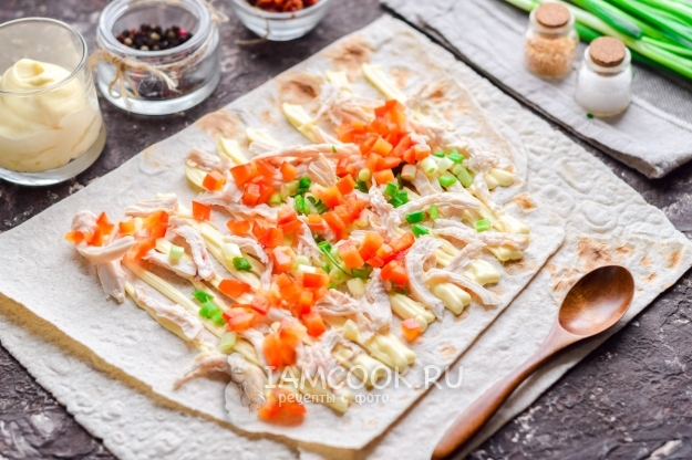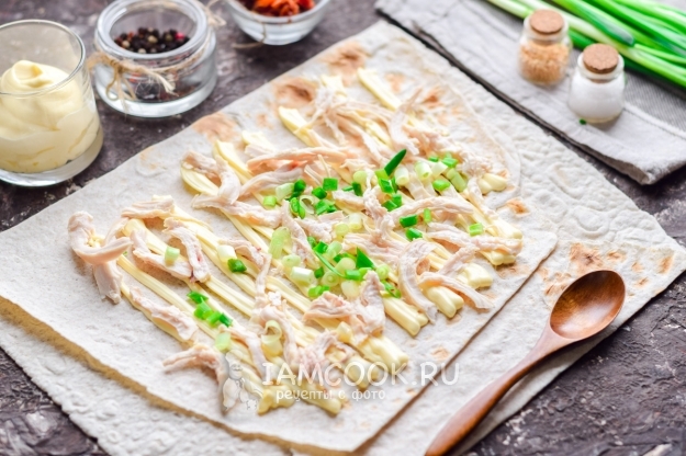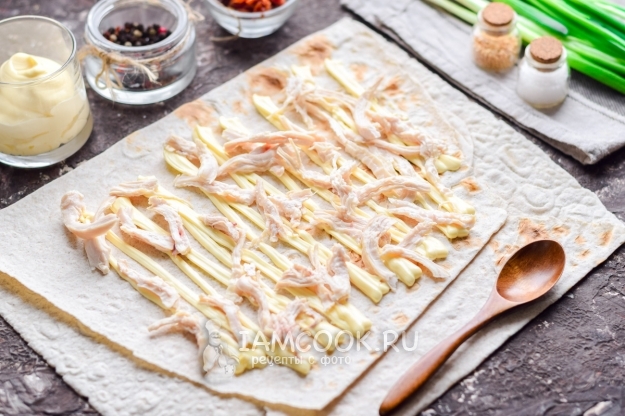 Вареное куриное филе нужно разобрать на волокна, после разложить филе по всей поверхности лаваша.