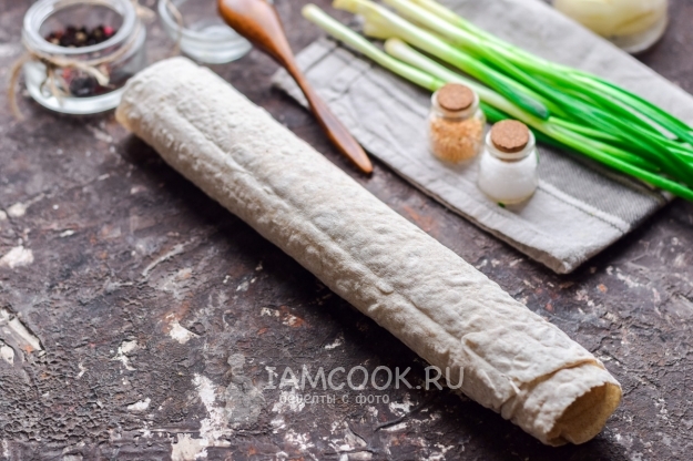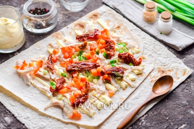 Немного зеленого лука сполоснуть и мелко нарезать. Лук разбросать по всему лавашу. От себя можете добавить любую зелень, которая вам нравится - укроп, петрушка, базилик – он прекрасно подойдет как к курице, так и к вяленым помидорам.
