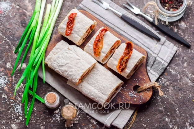 Рулет из лаваша с курицей и вялеными помидорами – прекрасный вариант необычной и бесподобной на вкус закуски, которая подойдет для застолий или семейных перекусов.