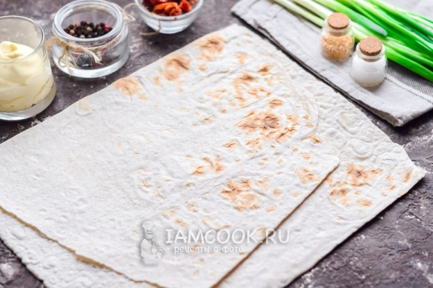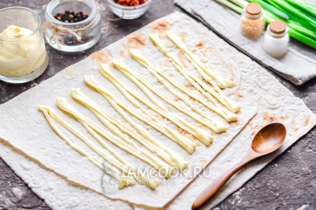 Смазать лаваш небольшим количеством майонеза, кстати, по желанию можно заменить майонез сливочным сыром.