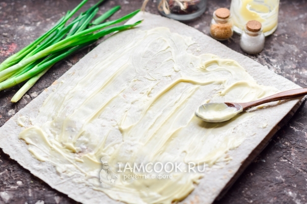 Лаваш расстелить на рабочей поверхности, смазать небольшим количеством майонеза. По желанию вместо майонеза использовать мягкий сливочный или плавленый сыр.