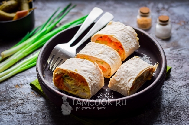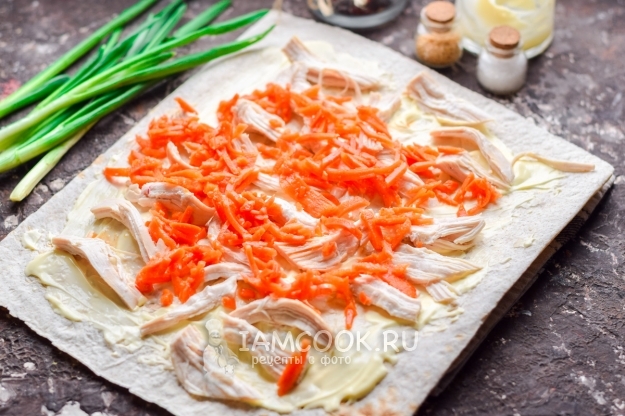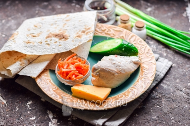 Особую изюминку здесь задает именно корейская морковь, она должна быть в меру пряной, островатой, сочной и пикантной, морковь легко можно сделать самостоятельно. Курицу мы заранее отварим, но здесь прекрасно подойдет также копченое куриное филе или окорок. Лаваш используем тонкий, бездрожжевой. Приступим.