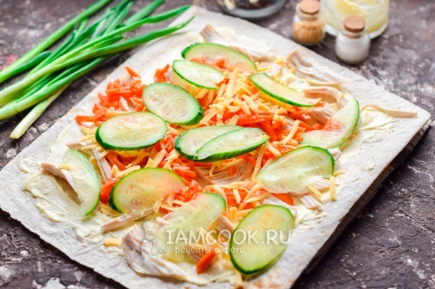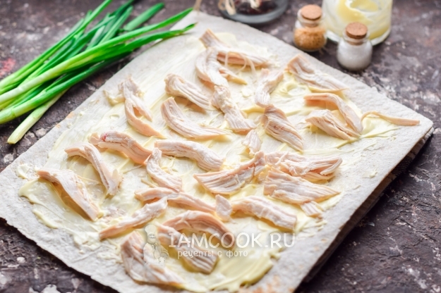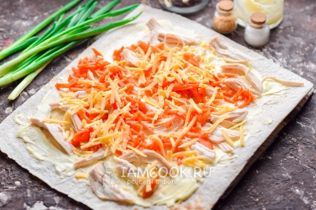 Куриное филе заранее отварить и остудить в бульоне. Филе разобрать на волокна и разложить по всей поверхности лаваша.