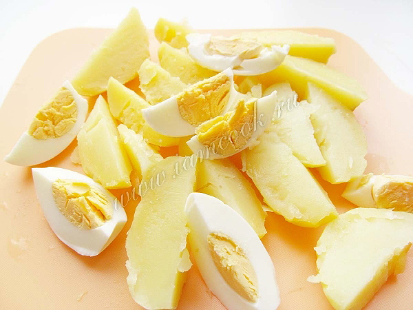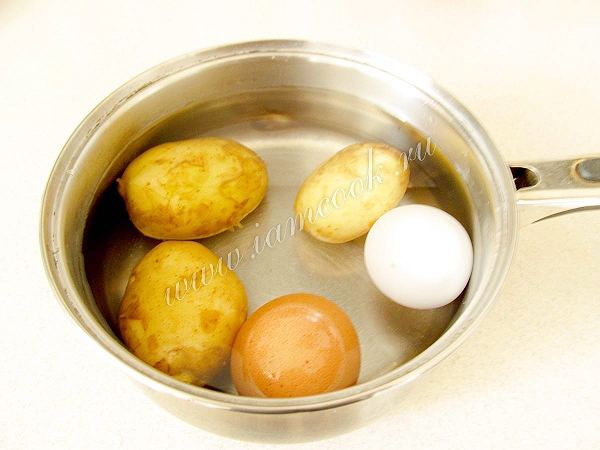 Картофель и яйца нужно отварить до готовности. Затем очистить.