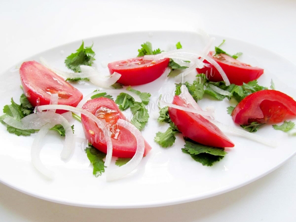 На блюдо выложить зелень и помидоры. Немного лучка.