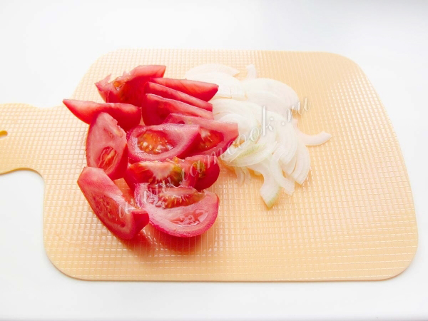 Тем временем нарезать ломтиками помидоры. Лук нарезать полукольцами и промыть от лишней горечи холодной водой. Сбрызнуть лимонным соком.