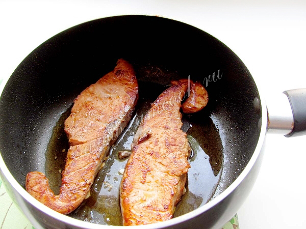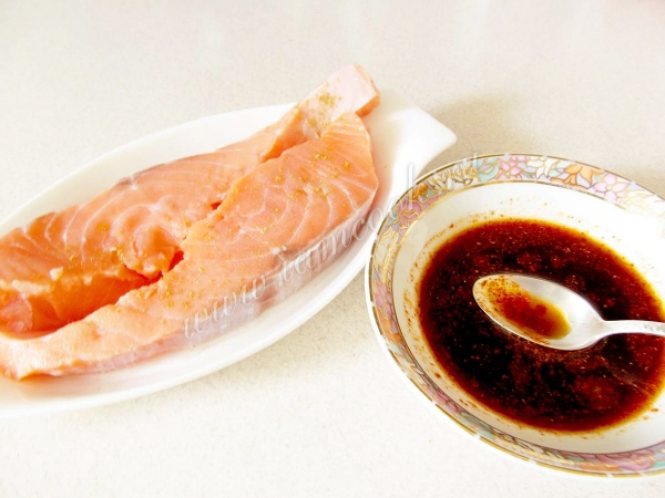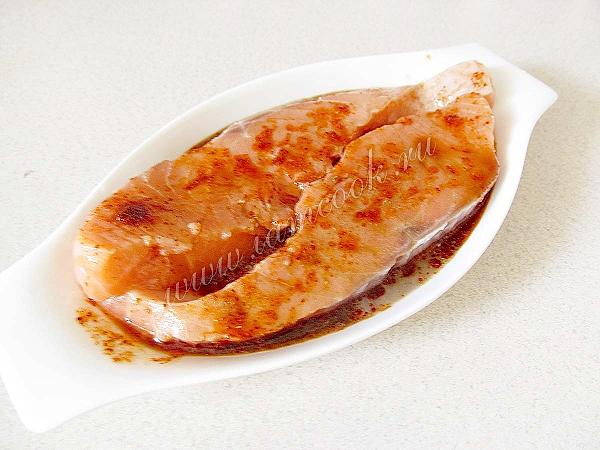 Стейк семги освободить от кожи и костей, замариновать в соевом соусе.