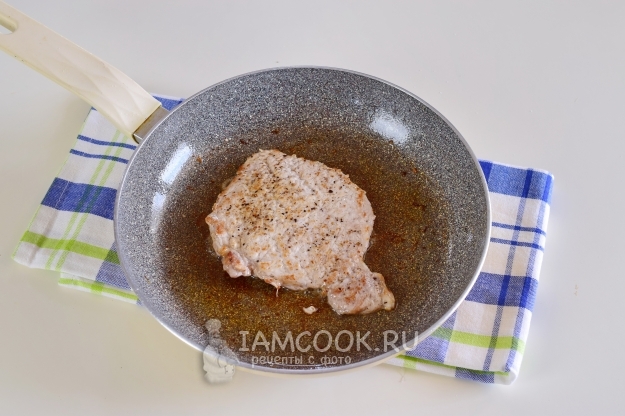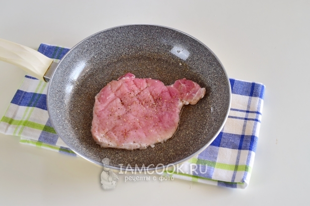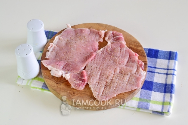 Отбитые куски свинины посолить и поперчить с обеих сторон.