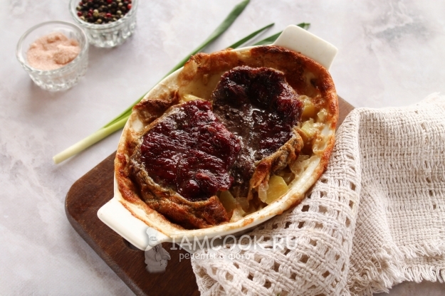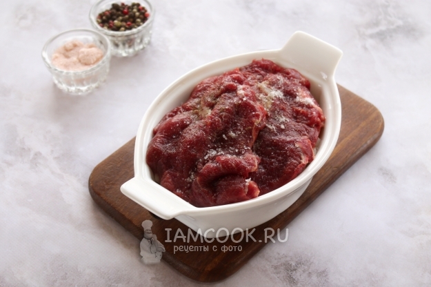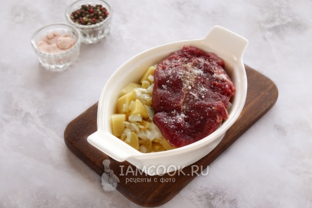 Мясные заготовки отбиваем, солим-перчим. Накрываем картошку с луком.