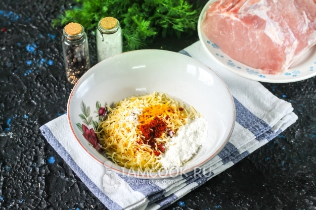 Влейте воду, всыпьте пшеничную муку, куркуму и молотую паприку, соль и молотый черный перец. Аккуратно взбейте все компоненты, создавая сырный кляр.