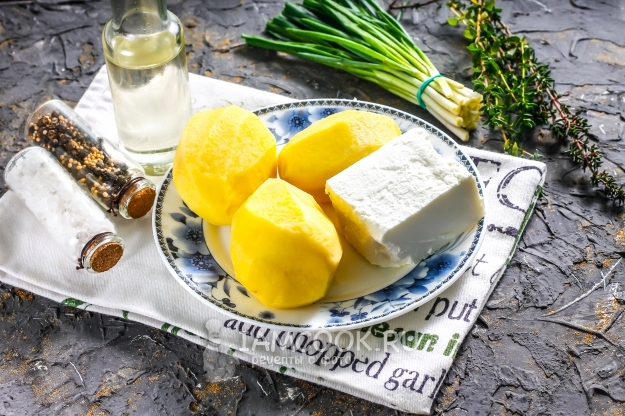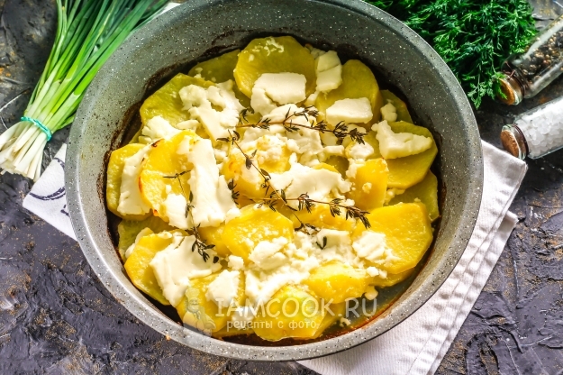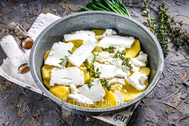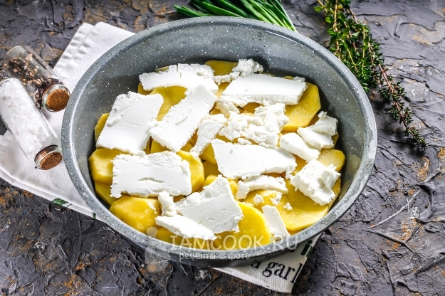 Нарежьте или натрите кусочек брынзы, выложите на картофельный слой. Если сыр соленый, то дополнительно использовать соль не нужно, и наоборот.