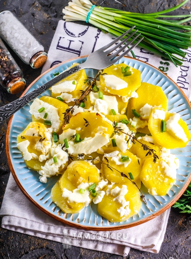 Если вы еще не решили, что будете подавать к столу на обед или ужин, то запеките картофель с брынзой в духовке. Блюдо получается не только вкусным и ароматным, но еще и сочным, так как брынза отдаст овощной нарезке свой сок, а сама станет тягучей. Брынза - это сыр «Фета», отличие может быть только в плотности сыра, в сроке его созревания. Чем старше сыр, тем менее он тягуч после запекания, но более ароматен! Если у вас свежая брынза, нарезайте ее ломтиками и выкладывайте на картофель, если состаренная, то натирайте на терке с мелкими ячейками.