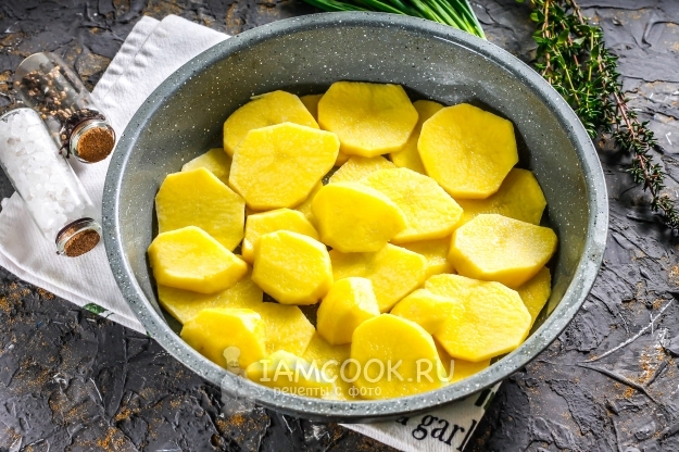 Картофельные клубни очистите от кожуры, тщательно промойте и нарежьте слайсами толщиной 0,5 см. Смажьте форму для запекания растительным маслом, выложите по кругу в нее картофельную нарезку.