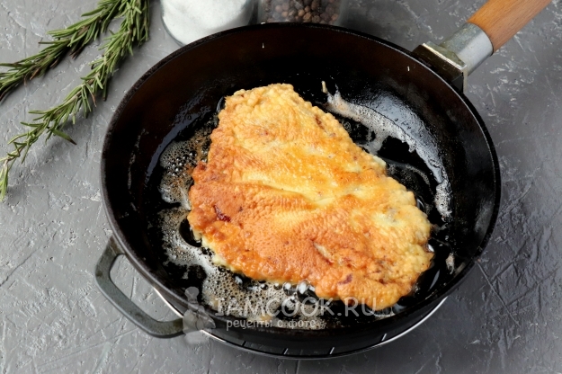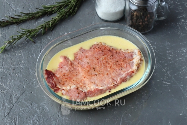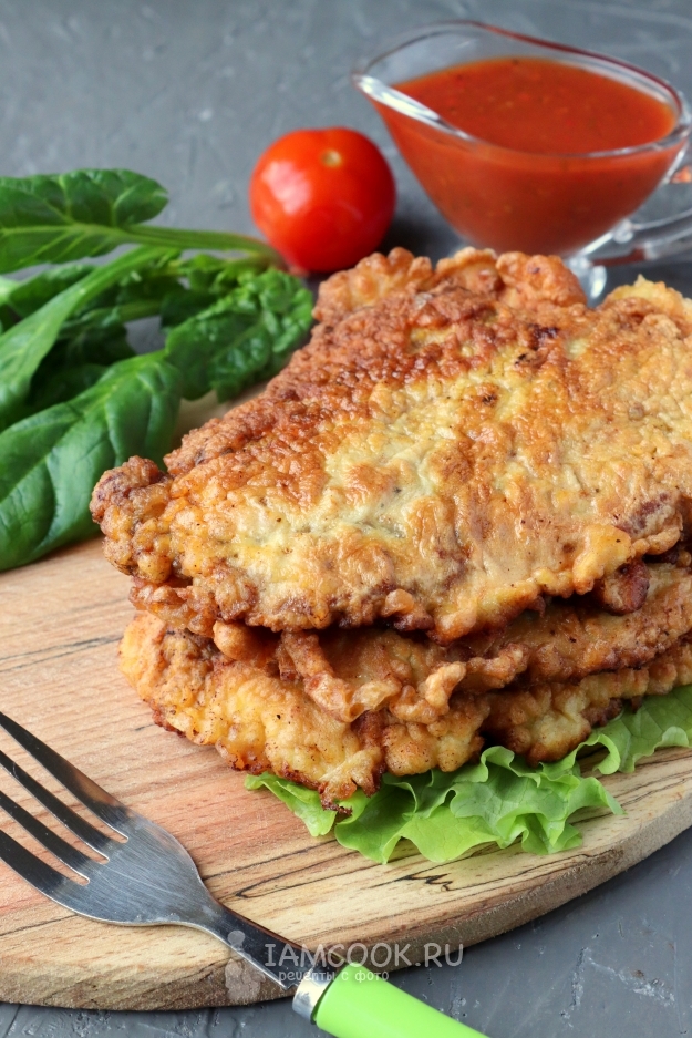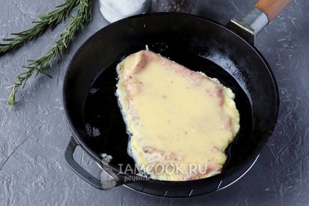 По очереди опустите подготовленные отбивные в кляр, чтобы он покрыл мясо с обеих сторон.
