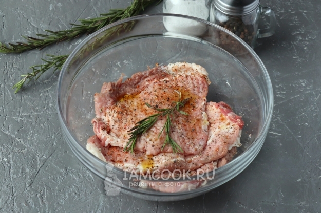 Каждый кусок мяса натрите специями. Затем сложите в миску, добавьте растительное масло и веточки розмарина. Аккуратно перемешайте и отправьте в холодильник на пару часов. Свинина должна настояться и пропитаться всеми вкусами и ароматами.