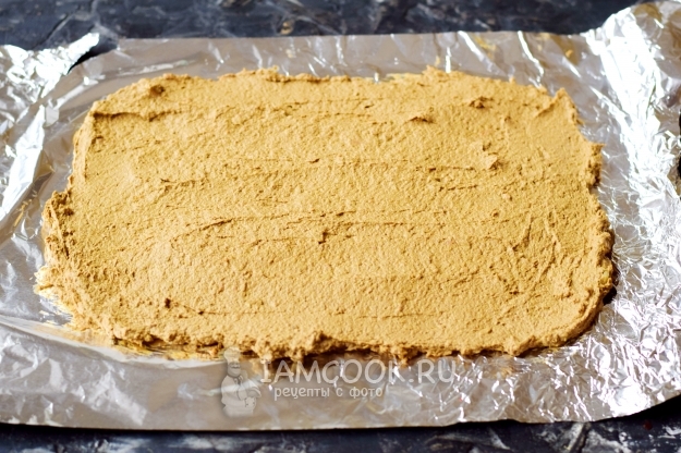 На рабочую поверхность постелите кусок фольги, разровняйте его, сверху выложите печеночную смесь. С помощью лопатки распределите ее по поверхности фольги, получая прямоугольный пласт толщиной не более 1 сантиметра.