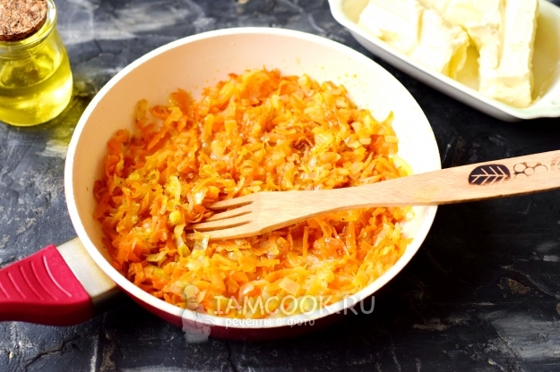 Морковно-луковую шинковку пассеруйте на медленном огне следующие 6-8 минут, прикрыв емкость крышкой. Шинковку овощей периодически перемешивайте лопаткой, избегая пригорания. Мягкие, пропитанные маслом овощи также немного остудите после пассеровки.