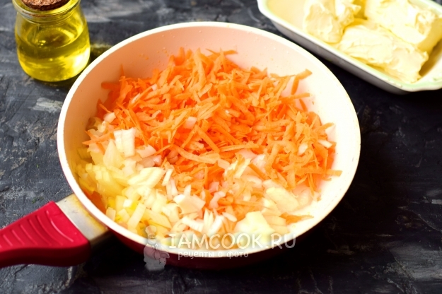 Параллельно приготовьте овощи. Лук и морковь освободите от верхнего слоя, морковь нашинкуйте полосками, используя терку, лук настрогайте ножом в виде кубиков. Смесь овощей закиньте в разогретую масляную сковороду.